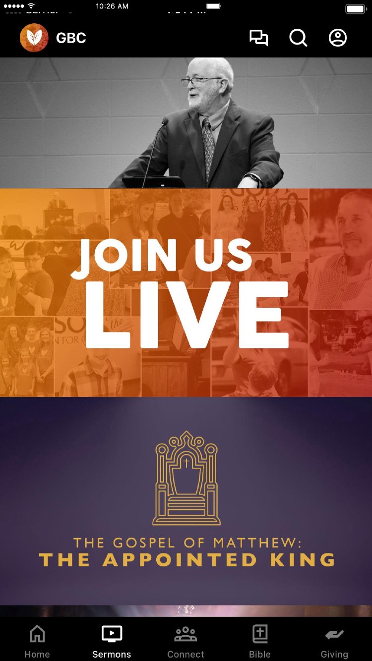 Our GBC app will help you grow in your spiritual walk through the expositional preaching and study of God's Word. You can tune into live streams, search for a past series, use the built-in Bible, connect to our church body through ministry group chats, or even through giving.