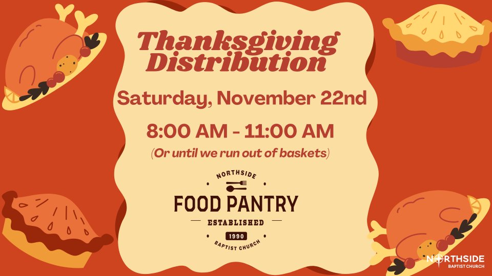 Early on Saturday morning, November 22, the Northside Baptist Food Pantry will open its doors to bless families in our community with a full Thanksgiving meal basket.