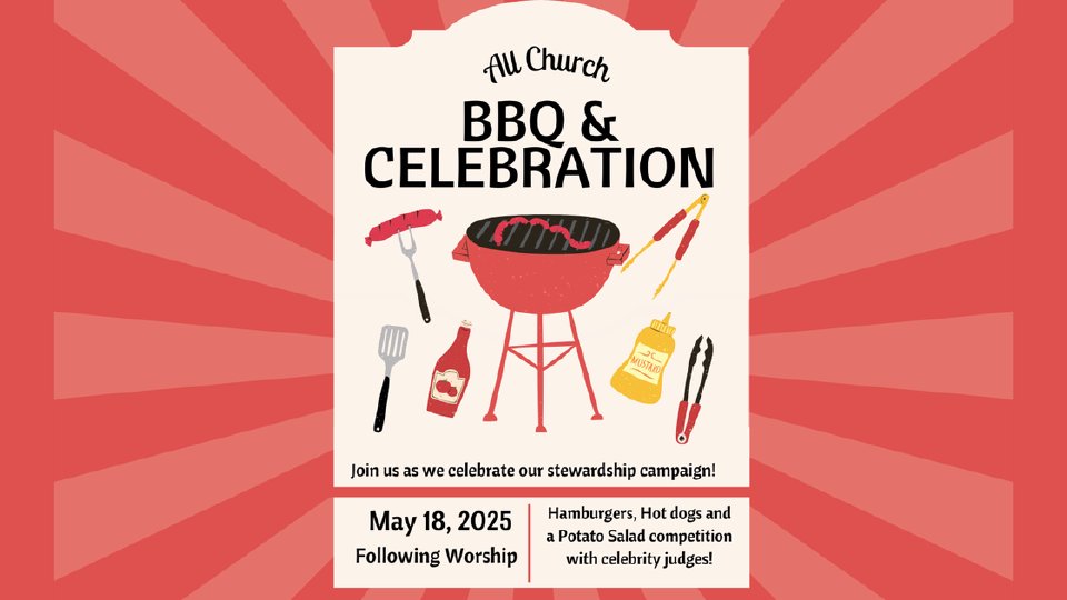 Make plans now to join in a celebration of our stewardship campaign as it concludes on May 18. Following worship we will be grilling hamburgers and hot dogs. There will also be a potato salad competition with celebrity judges.