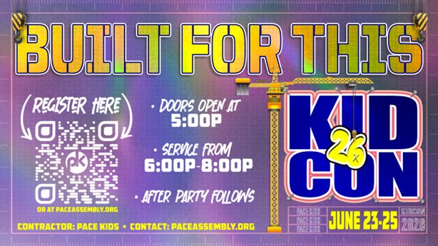 Kid Con 2026 will be an ACTION PACKED week of high energy services, pumping games and giving each child JESUS!!