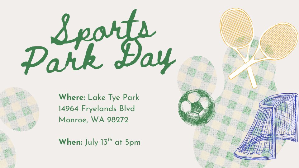 Join us for Sports Park Day at Lake Tye Park on Saturday, July 13th at 5pm! Weāre gathering for a fun evening of volleyball and a couple other lawn games at the park. Whether youāre a seasoned player or just in it for the good vibes and community, thereās a spot for you on the court. Bring your lawn chairs, water bottles, and that competitive spiritāor just come to cheer and hang out. See you there!