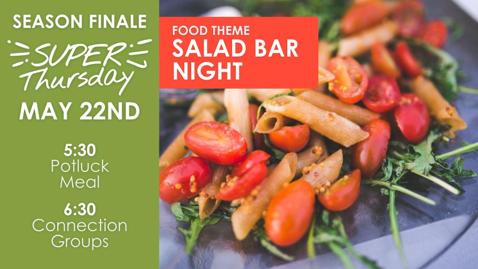 Enjoy an all-church meal at 5:30. This week's food theme is "Salad Bar."