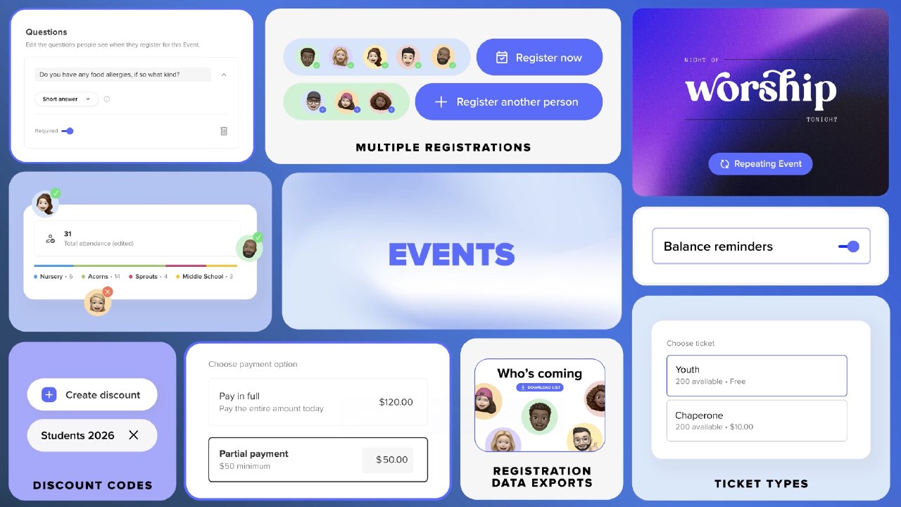 Subsplash Events makes it easy to plan church events, manage registrations, and collect payments through your app and website—all from one centralized dashboard.