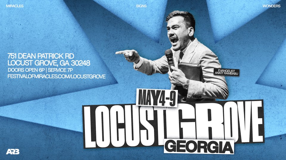 Revival is coming to Locust Grove, GA! Are you ready? Starting May 4th, get ready for six powerful nights of miracles, signs, and wonders! God has heard your cry and whatever you need is found in JESUS! Bring the sick, the hurting, and the lost - bring everyone! This region is about to encounter God in a mighty way, and God has something in store for you! Be there!