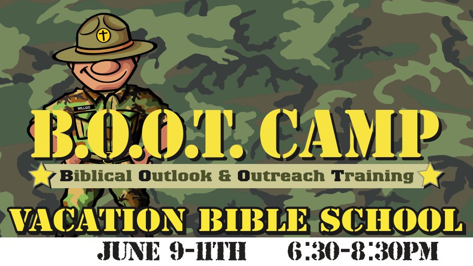 Victory Boot Camp VBS will be full of crafts, music, snacks, stories, and FUN!! Monday - Wednesday evenings from 6:30-8:30, your child will enjoy an incredible VBS experience that will help them grow in their faith and learn more about Jesus. It's completely free and open to ages 4 years - 5th grade. Register now!
