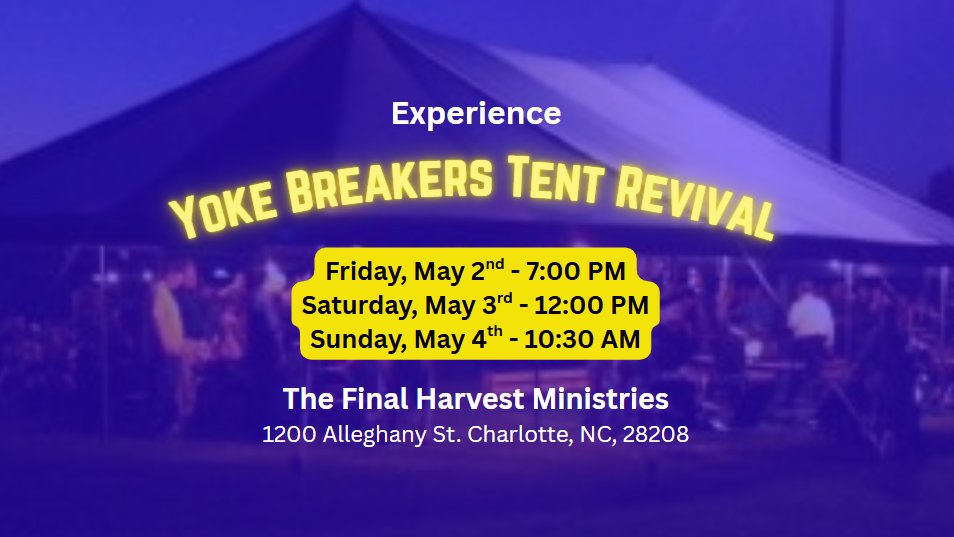 The Yoke Breaking Tent Revival, hosted by The Final Harvest Ministries, is a powerful, spirit-filled event designed to bring healing, deliverance, and spiritual breakthrough. Under the canopy of faith, attendees experience anointed preaching, fervent worship, and powerful prayer, breaking the chains of addiction, fear, and oppression. This revival focuses on the transformative power of God's love, offering freedom from life's burdens and a fresh encounter with His grace, preparing hearts for the final harvest.