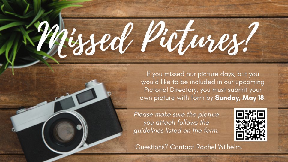 If you missed our picture days, but you want to be included in the upcoming Pictorial Directory, you must to fill out the form below and attach your own high-resolution file. Forms with pictures must be submitted no later than Sunday, May 18 to be included in the Pictorial Directory.