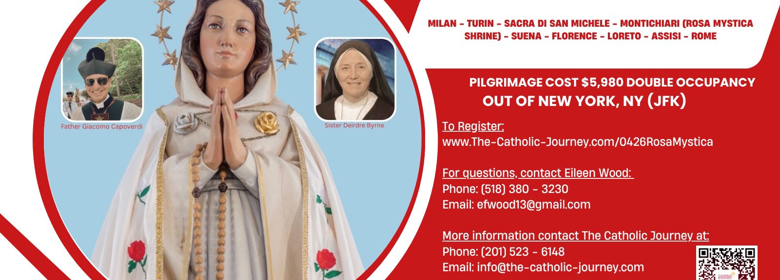 Embark on a sacred pilgrimage to Italy with the Rosa Mystica Family, guided by Father Giacomo Capoverdi and Sister Deirdre Byrne. The heart of our journey is a visit to Montichiari, where Our Lady first revealed herself as the Mystical Rose. We will also pray in Turin, Siena, Florence, Loreto, and Assisi. This is more than a trip—it is an encounter with grace through daily Mass, prayer, and reflection, deepening our devotion to Mary and her Son.