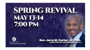 Spring Revival, Tuesday & Wednesday, May 13-14 at 7 pm nightly with special guest Rev. Jerry M. Carter, Jr. Ph.D., Pastor of Calvary Baptist Church in Morristown, NJ.