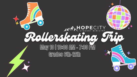 Grab your wheels and join Hope City Students Youth (grades 6th-12th) as we head out for a day of skating. Saturday May 10th will be a day of fun, laughter, and maybe even a few falls. Regardless, we are going to have a blast!