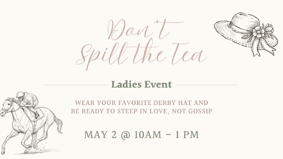 Sip, socialize, and steep yourself in wisdom at our elegant Kentucky Derby-themed tea party, "Don’t Spill the Tea." Enjoy a morning complete with delicious tea, delicate refreshments, and the required fashion statement—your most magnificent derby hat! We will engage in a session focused on being steeped in love, not gossip.