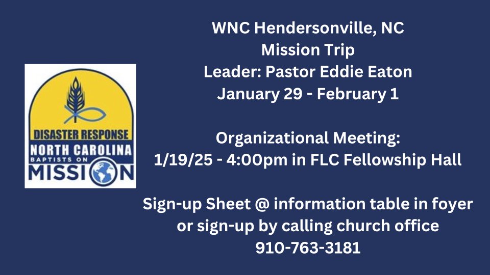 Leader: Pastor Eddie Eaton. Call Wrightsboro Baptist Church office to sign up 910-763-3181.