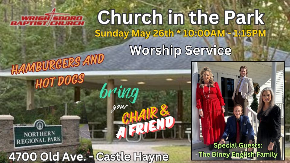 WBC will meet @ Northern Regional Park May 26th @ 10:00am. We'll be gathering for Worship in the park with special guests The Biney English Family providing a program of gospel music, then enjoying Hot Dogs, Hamburgers & Chips provided by WBC. This will be an awesome time of worship & fellowship as we lift up the name of Jesus in this outdoor setting. Our heart is to welcome anyone in the park to worship with us. Bring a friend and bring your chair!