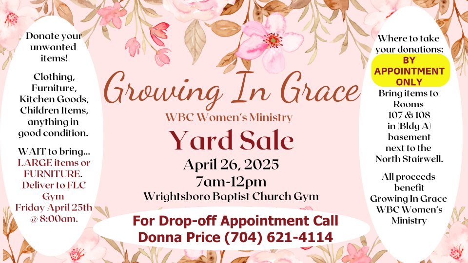 Huge yard sale! All proceeds will be used by our Growing In Grace Women's Ministry.