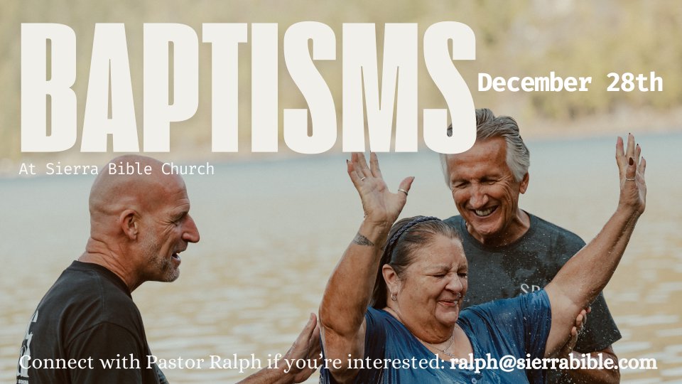Interested in being baptized? We will have a baptism Sunday Sunday on December 28th during both services! Contact ralph@sierrabible.com if you are interested in being baptized.