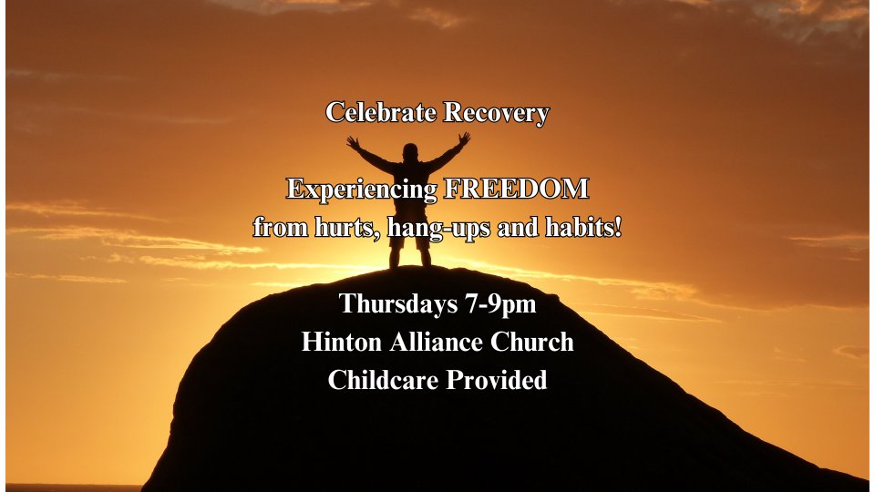 Celebrate Recovery is a Christ-Centered Recovery Program. It is a 12 step program that deals with your hurts, hang-ups and habits. Hinton Alliance Church Celebrate Recovery is a safe and confidential place to experience freedom.