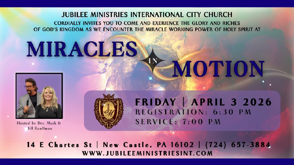 Jubilee Ministries International cordially invites you to come and experience the glory and riches of God’s kingdom as we encounter the MIRACLE working power of the Holy Spirit. Join us for a powerful time of healing and miracle encounters in the presence of the Holy Spirit.