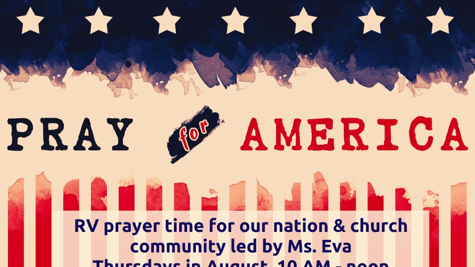 All are welcome to join Ms. Eva in August on Thursday mornings to pray for the future of our nation, the upcoming elections, and needs within our RV family. Feel free to come anytime between 10 AM and noon. This prayer meeting will occur every Thursday until the end of the month, weather permitting, and will take place in the prayer room in the office area.