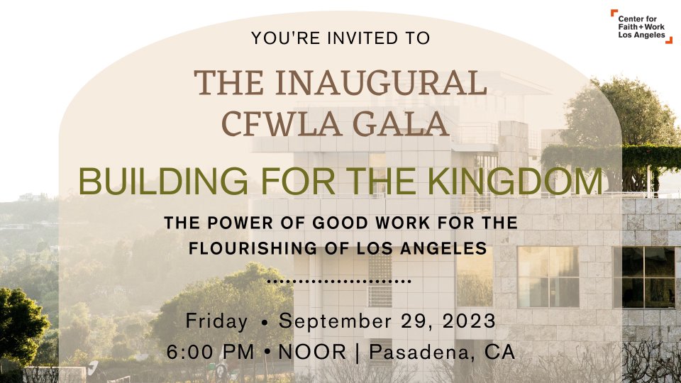 Join the Center for Faith + Work Los Angeles for an elegant evening at NOOR, a premier venue in Pasadena for cocktails, a multi-course dinner, a silent auction, entertainment, and more. The team is thrilled to have an inspiring keynote address from one of Southern California's most accomplished builders and community members, John Daly. As CFWLA seeks to raise support to make the goals they have for 2024 and beyond possible, your attendance will directly help fuel their mission of helping Angelenos reframe their vocations to reshape culture. Multiple pricing and sponsorship levels available.