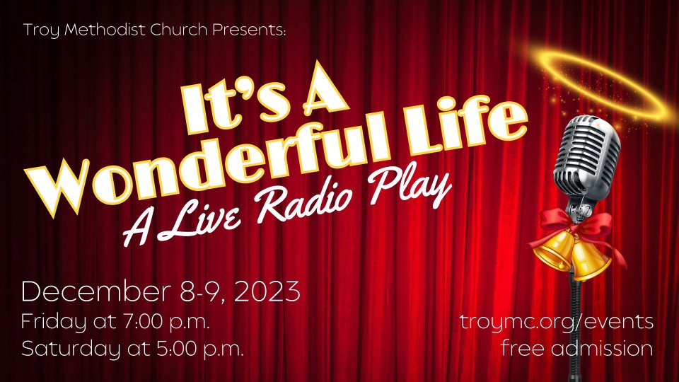The Troy Methodist Church Players present... "It's a Wonderful Life, A Live Radio Play" Inspired by the classic 1946 Frank Capra Film, this version is performed as a 1940's live radio broadcast. Eighteen of our actors perform the forty-four characters with four Foley Artists providing the live sound effects. Three female studio singers lend their talents singing jingles from vintage 1940's radio commercials. With its themes of self sacrifice and that everyone's life touches so many other lives, the play sends a powerful message about God's grace. Performances will be held in the Family Life Center. There is no charge for admission. A free will offering is optional. Join us for an evening of nostalgic holiday fun!