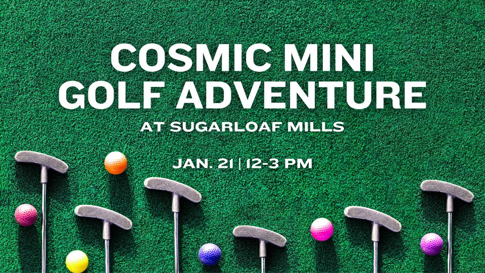 Experience the excitement of mini golf with a cosmic twist. Join us for lunch and an out-of-this-world of cosmic mini golf at Sugarloaf Mall. Invite a friend! Date: Sunday, January 21 Time: 12:00 PM - 3:00 PM Location: Depart from Berkmar Campus.