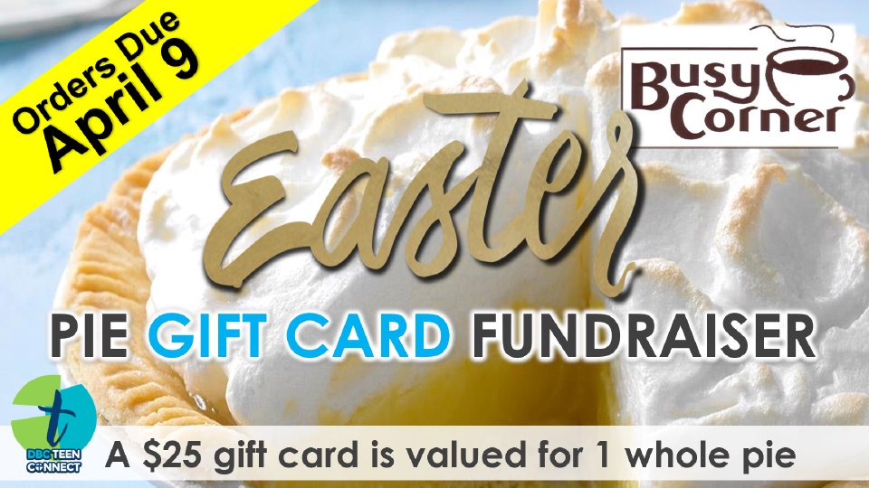 The teens are selling Busy Corner Pie Gift Cards just in time for Easter! Purchase a gift card and get your pie any time you want! This will help fund upcoming teen events and activities.
