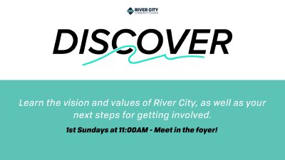 If you are new to River City or want to find out more, join us for this once a month Meet-N-Greet with a class. Offered the first Sunday of each month (most months), it is designed to get you started on your journey to real life here at River City. *Meet at 10:30 am in the cabana in the courtyard to your left - look for the Discover banner. Enjoy coffee and pastries as you get to know some of our pastors and ministry leaders. From there, we will walk over to the Discover Class.