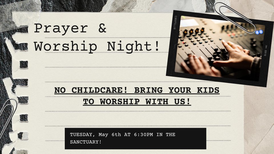Join us for a prayer and worship night happening on Tuesday, May 6th at 6:30pm in the church sanctuary. No childcare will be available as we encourage you to bring your children to worship with us!