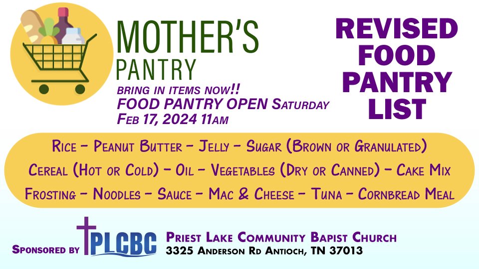 The Food Pantry will be open on Saturday, 2/17/24. An updated list of food items are available on the event flier as well as the church website.