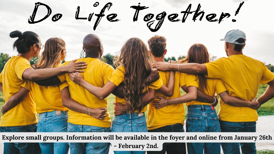 On January 26th, 2025, and the following Sunday, February 2nd, you will have a chance to find out about all the NEW & existing small groups we have to offer. Our leaders will be answering your questions out in the foyer, so come learn about all the ways to connect and share life together!