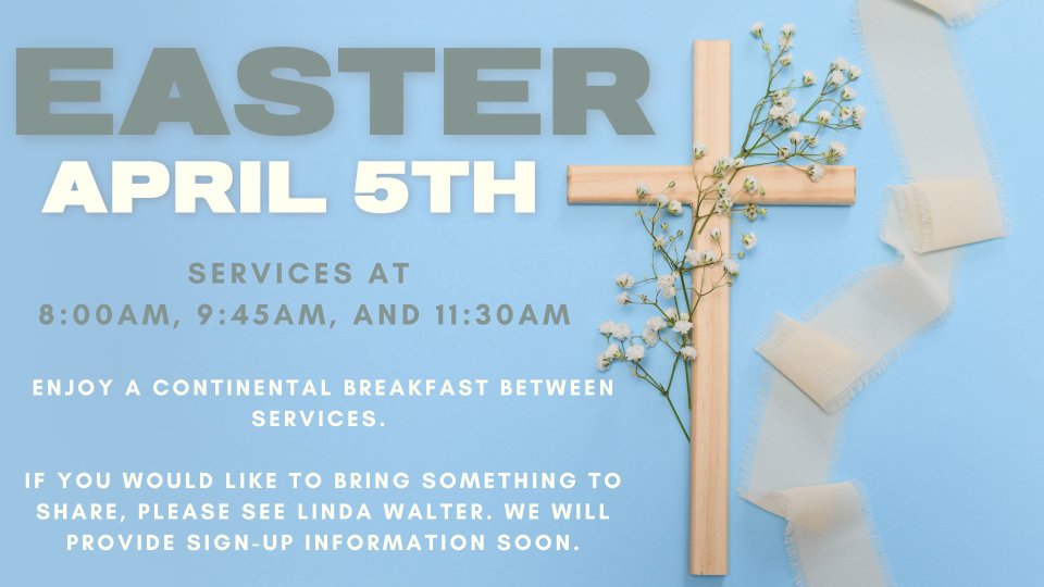 Join us Easter Sunday for a joyous celebration of Jesus’ victory over the cross and the gift of eternal life! Experience the power of the resurrection at our services at 8:00am, 9:45am, and 11:30am. Enjoy a continental breakfast between services. If you would like to bring something to share, please see Linda Walter. We will provide sign-up information soon.