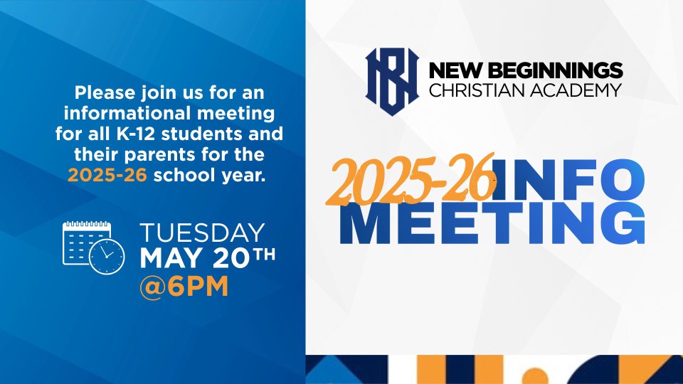 You have questions, we have answers! Come one, come all to the New Beginnings Christian Academy informational meeting for the 2025-26 school year.