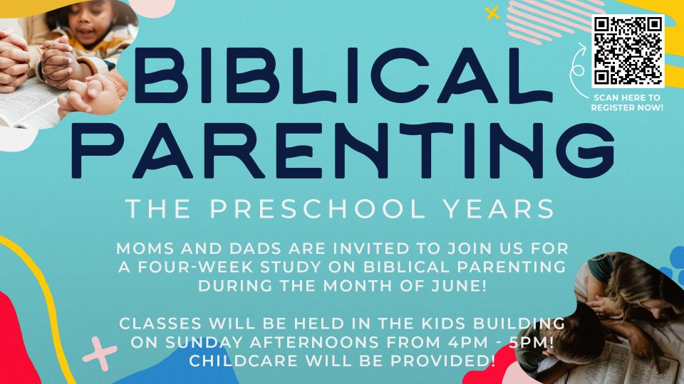 Moms and Dads are invited to join us for a four-week study on Biblical Parenting during the month of June! Classes will be held in the Kids Building on Sunday Afternoons from 4pm - 5pm on June 1st, June 8th, June 22nd, and June 29th. Childcare will be provided! We can't wait to see you there!