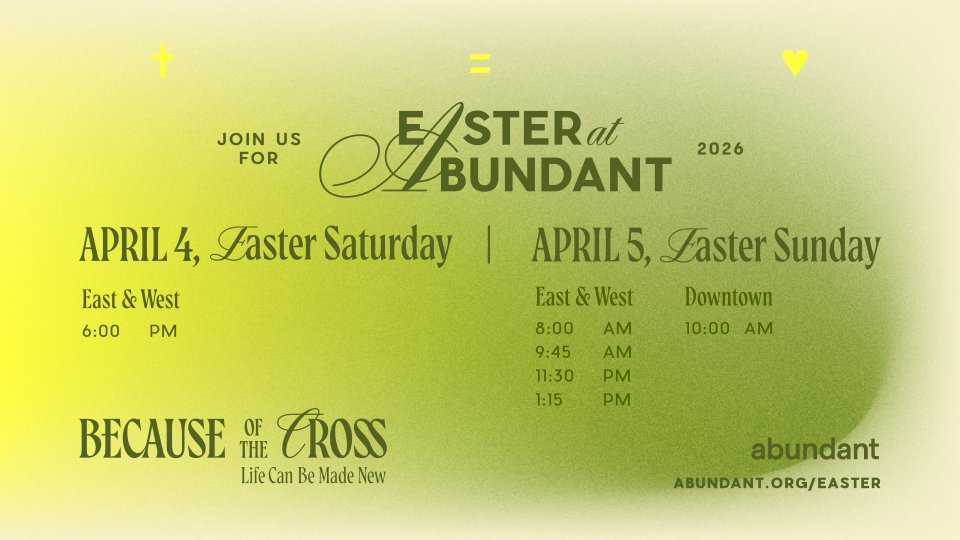 Celebrate the resurrection of Jesus with us at Abundant. Bring your friends and family and experience powerful worship, a life-giving message, and the hope of new life through Christ.