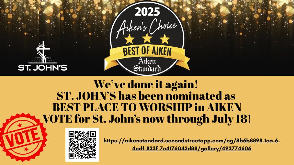 St. John's has been nominated again as "Best Place to Worship in Aiken." Vote today through July 18, 2025 at the Aiken Standard: https://www.postandcourier.com/aikenstandard/contests/aikenschoice/#/gallery/492774606/