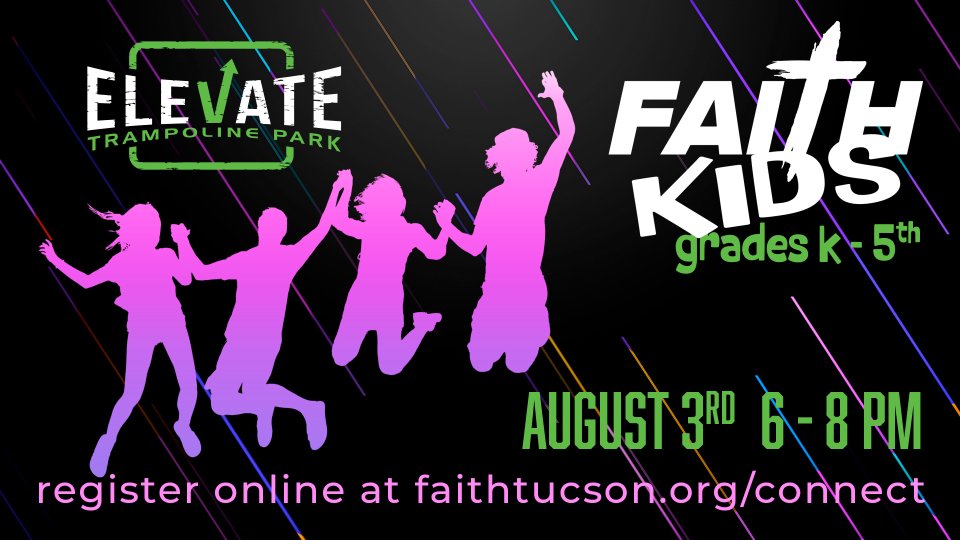 Come join us for a fantastic FaithKids trampoline extravaganza at Elevate Tucson from 6-8 pm. The cost is $5 per person.
