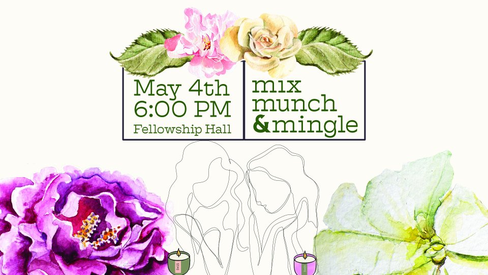Join us for Mix, Munch, and Mingle on Sunday, May 4, from 6:00–8:30 PM in the Fellowship Hall! Bring your favorite appetizer to share as we enjoy meaningful conversations, fun games, and delicious food. Together, we'll explore how to let our unique lights shine for God's glory.
