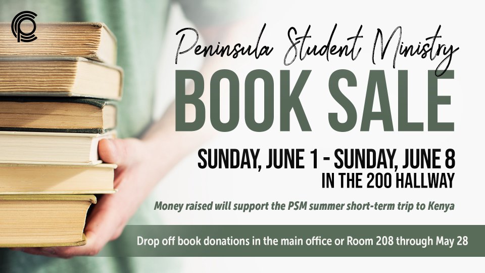 PSM is having a used book sale in the 200 hallway beside the gymnasium. All the proceeds will go to support students going on the PSM summer short term trip to Kenya. Each book will be sold for $1 and any additional donations on top of the price of the book(s) are accepted. Book donations for the sale will be accepted at PCC untill May 28. Books can be dropped of at the main office or room 208.