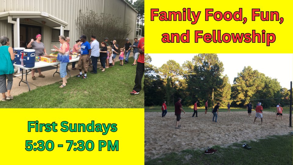 Family Food, Fun, and Fellowship is held on MOST first Sunday evenings from 5:30-7:30 PM. It is usually held outdoors at the church. People bring finger foods such as sandwiches, chips, soft drinks, and desserts. Kids play on the playground or in the churchyard. Youth and adults can play volleyball or just hang out and talk. During wet or cooler weather it may be moved indoors or to a skating rink.
