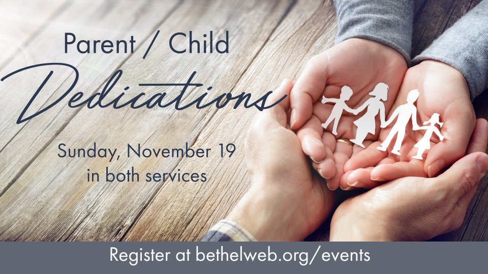 Parents have the greatest influence in guiding their child’s spiritual journey. At Bethel, we want to help parents disciple their children to know and love Jesus Christ. A Parent/Child Dedication is being held Sunday, November 19, during both services at each campus. If you are interested in dedicating your child, you must register online by November 9. Parents/legal guardians are required to attend the Parent/Child Dedication class (unless you have already attended it in the past). Use the link below to register for the Crown Point campus.