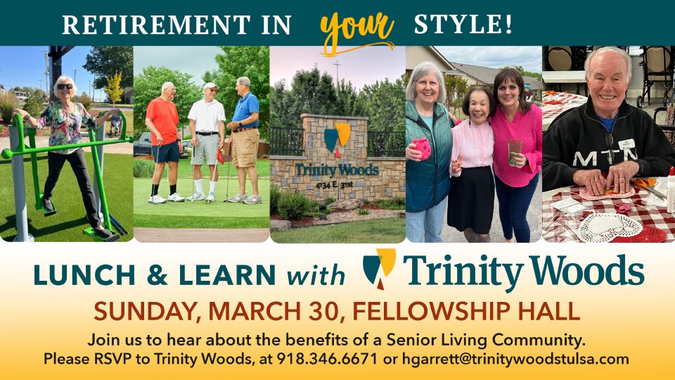 Hear about the benefits of a Senior Living Community and learn about Trinity Woods! Please join us on Sunday, March 30, in the Fellowship Hall just after the 10:50 a.m. worship service. At this complimentary lunch, you will receive information about senior living options and what is happening at Trinity Woods, formerly Oklahoma Methodist Manor. For nearly 70 years, our mission has been to serve the Tulsa area in the spirit of Christ. Trinity Woods offers people a retirement life that has a style all its own. Your style! RSVP to Trinity Woods, at (918) 346-6671 or hgarrett@trinitywoodstulsa.com.