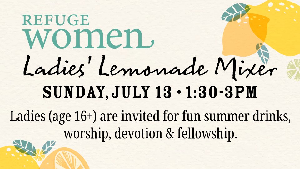 Ladies ages 16+ are invited for lemonade, cold press coffee, and other fun summer drinks as we enjoy a short time of worship, a devotional led by Kim VanVooren and time for fellowship.