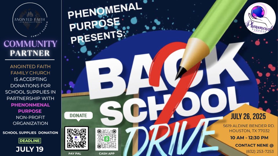 We are partnering with Phenomenal Purpose Non-Profit Organization for their 4TH Annual Back to School Drive.