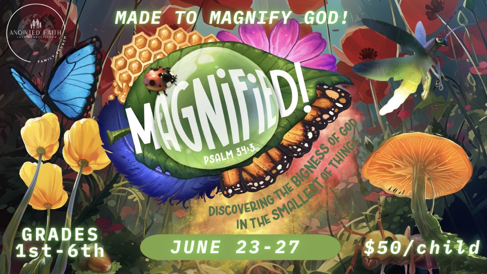 Magnified! VBS will encourage kids to look closely at the details of God’s amazing world and magnify, or proclaim, God's greatness. God made us, cares about us, loves us, forgives us, and is faithful to keep all His promises to us. We can praise God together! We were made to magnify God!