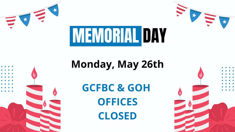 The GCFBC & GOH offices will be closed on Memorial Day in observance of the holiday. We honor and remember those who sacrificed for our freedom, and will resume normal office hours the following day.