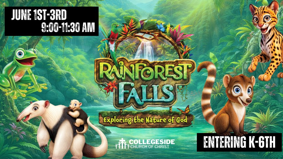 Join us for an adventure at Rainforest Falls, where kids explore the nature of God—discovering who God is and how much he loves them! Kids participate in memorable Bible-learning activities, sing catchy songs, play teamwork-building games, make and devour yummy treats, experience one-of-a-kind Bible Adventures, collect Bible Memory Buddies, and test out sciency-fun experiments they’ll never forget. Plus, kids will learn to look for evidence of God all around them through something called God Sightings. Each day concludes with a Canopy Closing that gets everyone involved in living what they’ve learned