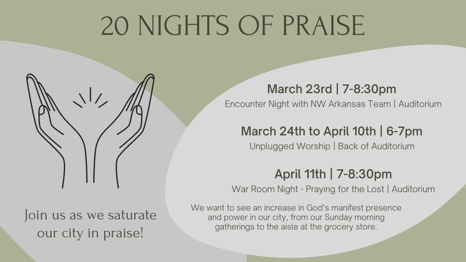 Join us for 20 Nights of Praise. We want to see an increase in God’s manifest presence and power in our city, from our Sunday morning gatherings to the aisle at the grocery store. Jump in with us as we saturate Fort Collins with praise. Every night at 6pm in the Sanctuary for an unplugged worship time and intercession.