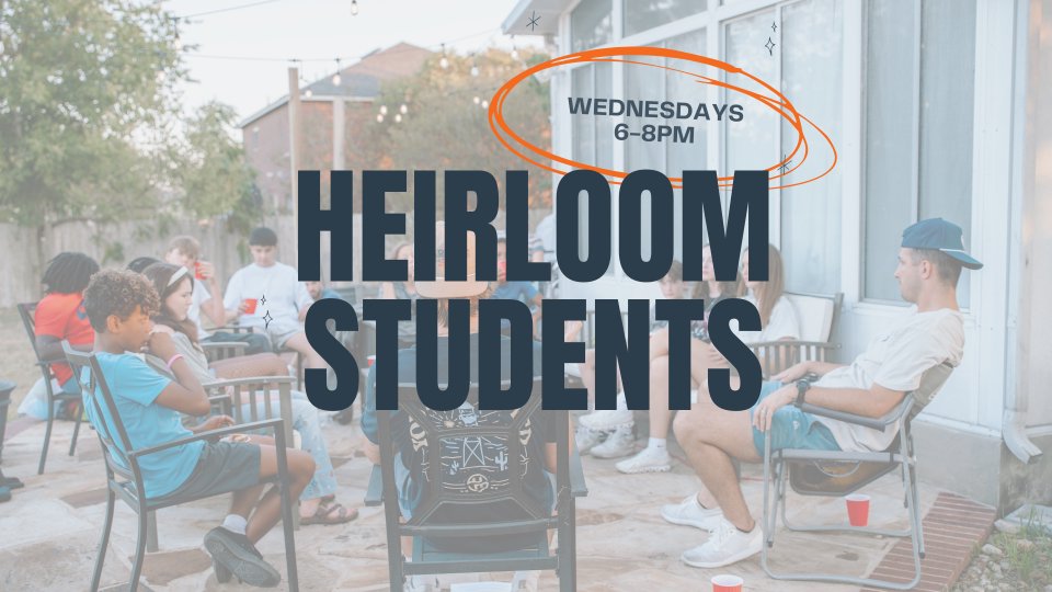 Heirloom Students meets every Wednesday night from 6–8 PM at 200 S Sledge St, Kyle, TX, 78640. Join us as students gather weekly for community, fun, and growth together. We can’t wait to see your students there!