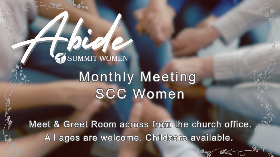 Gather in the Meet and Greet room for Abide's (Summit Women) monthly meeting. We will be studying "In His Image" by Jen Wiklin. All ages are welcome. Childcare will be available.