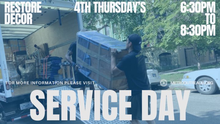 On the fourth Thursday of every month, from 6:30 p.m. to 8:30 p.m., Metro Outreach will partner with Restore Décor for a local service project.